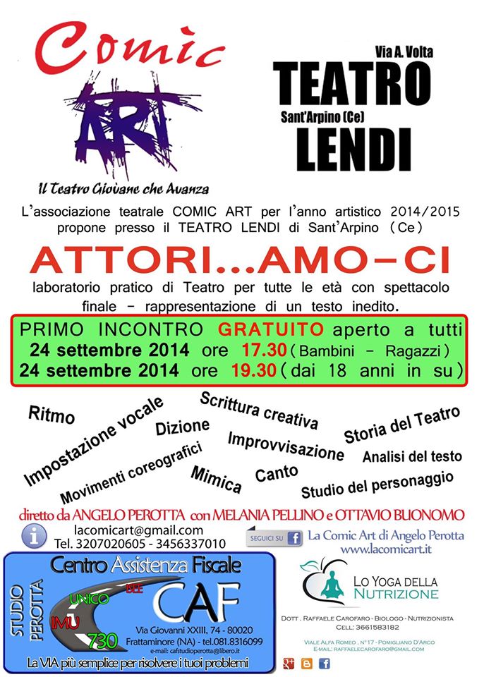 La COMIC ART di Angelo Perotta e gli attori coinvolti vi aspettano il 24 settembre per il primo incontro gratuito presso il Teatro Lendi di S.Arpino sito in via A. Volta. Per avere maggiore informazioni circa l’iscrizione e gli orari del primo incontro, chiamate al numero 3207020605.