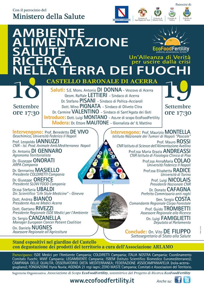 Prenderanno parte all’incontro acerrano, tra gli altri, Benedetto De Vivo, geochimico della Federico II, Leopoldo Iannuzzi, del Cnr, Gennarino Masiello, presidente della Coldiretti Campania, Giuseppe Orefice, presidente Slow Food, l’assessore regionale all’Agricoltura Daniela Nugnes, Maurizio Montella, dell’Istituto Nazionale dei Tumori di Napoli ‘Pascale’, Annamaria Colao, ricercatrice della Federico II, Luigi Nicolais, presidente nazionale del Cnr, Donato Cafagna, Commissario Antiroghi, Sergio Costa, comandante regionale della Forestale, l’assessore regionale alla Ricerca Guido Trombetti, l’on.le Luigi Famiglietti ed il sottosegretario alla Salute Vito De Filippo. Partecipano all’iniziativa Comitati ed associazioni ambientaliste: nei giardini del Castello ci saranno stand espositivi con degustazione dei prodotto del territorio a cura del consorzio di agricoltori locali Ari.Amo. La verità su quanto succede nella Terra dei Fuochi con i diversi interventi per la sua salvaguardia: tra le inizative più interesanti c’è il progetto di ricerca EcoFoodFertility, che rappresenta il primo studio scientifico multicentrico e multidisciplinare che affronta in maniera sistematica l’impatto delle condizioni ambientali sulla salute umana, considerando sia gli aspetti alimentari che quelli legati in generale allo stile di vita. Il fine non è solo quello di dare evidenze scientifiche più corrette, precise e definitive al rapporto ambiente-salute (nesso di causalità), visto che al momento gli studi epidemiologici ‘ipotizzano’ che la presenza di alti livelli di inquinanti ambientali (metalli pesanti, PCB, diossine, Nanoparticelle, IPA) possa avere effetti nocivi sulla salute umana contribuendo all’insorgenza di cancro, malattie cardiovascolari, anomalie congenite, malattie immunologiche e disordini endocrino-metabolico, ma anche quello di fornire nuovi e più affidabili indici di rischio della salute (biomarker), predittivi per possibili future patologie legate a stili di vita scorretti e/o a cause ‘ambientali’, verificare l’efficacia di taluni regimi dietetici e di innovativi approcci nutrizionali potenzialmente protettivi, infine indicare nuovi indirizzi di politiche sanitarie pubbliche di prevenzione del rischio e salvaguardia della salute soprattutto per popolazioni che vivono in aree ad alto impatto ambientale.