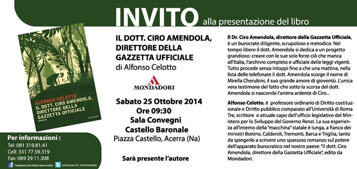 ACERRA – Sabato 25 ottobre alle ore 9.30, presso la sala convegni del palazzo baronale di Acerra sarà presentato il libro, “Il dottor Ciro Amendola, direttore della Gazzetta Ufficiale”, opera prima di Alfonso Celotto, edizioni Mondadori.L’iniziativa a cura della Pro Loco di Acerra, diretta dal presidente Antonio Puzone.