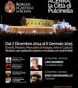 Fine d’anno all’insegna del teatro per il programma di “Borghi e castelli in scena” con la Compagnia teatrale “Napoli Incanto” e lo spettacolo “Pulcinella e Mozart” in programma per lunedì 29 dicembre, alle ore 20,30, e martedì 30 dicembre con Teatro Rostocco e lo spettacolo “Finchè c’è guerra c’è speranza”. A Salutare il 2015 sarà il Civico Complesso Bandistico “G.Pinna” con “Benvenuti ad Acerra”, in concerto la sera del 1 gennaio 2015; venerdì 2 gennaio nuovo concerto con i “Suoni Barricati”, il 3 gennaio alle ore 20,30 torna il cabaret con “Doppia Coppia”, mentre il 4 gennaio si esibiranno gli “Arteteca”, lunedì 5 gennaio 2014 il gruppo “Frequenza diverse” in concerto e grande chiusura il 6 gennaio con “Enrico Ruggeri” in concerto con trio al Castello Baronale di Acerra.