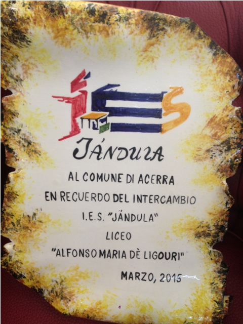 ACERRA – Il liceo “Alfonso Maria de’ Liguori” di Acerra è promotore di un progetto di gemellaggio con la scuola “Ies Jandula” di Andujar (Spagna), (nella foto il riconoscimento del progetto dell’anno scorso) al fine di educare le giovani generazioni a vivere una piena cittadinanza europea, che si articolerà in due momenti differenti: sul territorio del Comune di Acerra (con la visita dei ragazzi e dei professori spagnoli) dal 12-19 marzo e in Spagna (con il trasferimento degli alunni e docenti acerrani) dal 5 – 11 aprile.