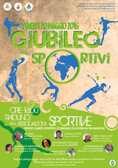 Nel pomeriggio, dunque, migliaia di giovani si raduneranno allo stadio ‘Comunale’ di Acerra per una grande festa dello sport, con le testimonianze di Gianni Maddaloni, maestro di arti marziali a Scampia e padre di Pino, medaglia d’oro olimpica di Judo, don Mario Lusek, direttore dell’Ufficio per la pastorale dello sport della Conferenza episcopale italiana, Massimiliano Castellani, Capo servizi sportivi di Avvenire, autore del libro “SLA. Il male oscuro del pallone”, Alessandra Borgonovo, figlia di Stefano e vicepresidente della Serie D Lega Pro e Carmine Russo, arbitro di Serie A Mauro Berruto, già allenatore della Nazionale di pallavolo maschile medaglia olimpica a Londra, ha inviato un messaggio augurale, mentre il sindaco di Acerra Raffaele Lettieri porterà il saluto della città.