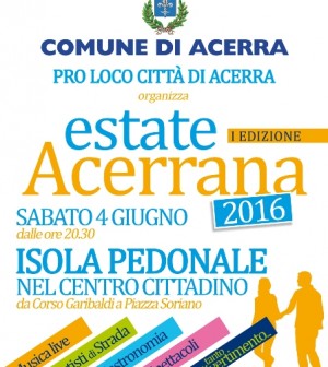 Comincia domani 4 giugno l’evento “Estate Acerrana”: a partire dalle ore 20,30 sarà istituita l’isola pedonale nel centro cittadino, da Corso Garibaldi a Piazza Soriano, per permettere la realizzazione di spettacoli di artisti di strada e per bambini, musica live con gruppi di giovani artisti, degustazioni e tanto divertimento.