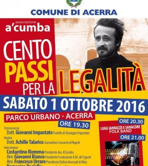 ACERRA – I cento passi della legalità’. E’ nel ricordo e sull’esempio di Peppino Impastato che domani sera ad Acerra si parlerà di legalità e di mafia. L’iniziativa, prevista dalle 19,30 nel Parco Urbano di via Sand, rione Spiniello, è organizzata dall’associazione A’ Cumba che vedrà il presidente Costantino Riemma tra coloro che interverranno. Un incontro che si preannuncia una vera e propria lezione di educazione civica, alla quale daranno il loro apporto il sindaco di Acerra Raffaele Lettieri, l’assessore alle Legalità del Comune di Acerra Domenico Paolella, l’avvocato Giovanni Bianco, presidente della Fondazione Alfonso Maria de’Liguori, l’avvocato Francesco Urraro, presidente dell’Ordine degli Avvocati di Nola.