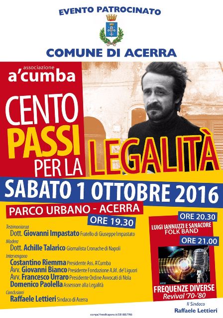 ACERRA – I cento passi della legalità’. E’ nel ricordo e sull’esempio di Peppino Impastato che domani sera ad Acerra si parlerà di legalità e di mafia. L’iniziativa, prevista dalle 19,30 nel Parco Urbano di via Sand, rione Spiniello, è organizzata dall’associazione A’ Cumba che vedrà il presidente Costantino Riemma tra coloro che interverranno. Un incontro che si preannuncia una vera e propria lezione di educazione civica, alla quale daranno il loro apporto il sindaco di Acerra Raffaele Lettieri, l’assessore alle Legalità del Comune di Acerra Domenico Paolella, l’avvocato Giovanni Bianco, presidente della Fondazione Alfonso Maria de’Liguori, l’avvocato Francesco Urraro, presidente dell’Ordine degli Avvocati di Nola.