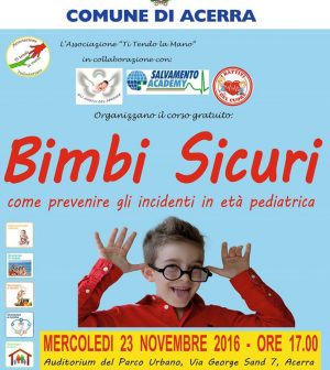 L’evento è alla seconda edizione: un incontro formativo al Parco Urbano di via Sand.ACERRA – ‘Bimbi sicuri’, via alla seconda edizione del corso. L’appuntamento è per domani pomeriggio: si tratta di un incontro formativo, aperto soprattutto alle mamme, sulla prevenzione degli incidenti in età pediatrica.
