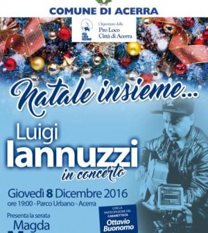 ACERRA – Con il concerto di Luigi Iannuzzi nel Parco Urbano di via Sand prende il via questa sera ad Acerra il programma di eventi per le festività natalizie organizzato dalla Pro Loco. Insieme all’esibizione del talentuoso musicista è salito sul palco anche il cabarettista Ottavio Buonomo.
