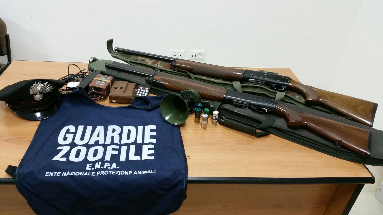 L’operazione dei carabinieri e dell’Ente Nazionale Protezione Animali: sequestrati anche richiami e fucili.