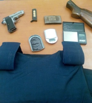 Le ispezioni, dunque, vennero estese a tutto il locale che venne aperto dallo stesso giovane, il quale si assunse la responsabilità di tutto ciò che venne rinvenuto. Adagiato su un porta utensili dell’ingresso c’era un panetto di hashish dal peso di 100 grammi. Ciò che però fece più scalpore fu una pistola cromata calibro 7,65 con colpo in canna ed altri sette proiettili nel caricatore, un borsone contenente un giubbotto antiproiettile e il calcio in legno di un fucile da caccia. L’arma risultò rubata e denunciata nel 2003.