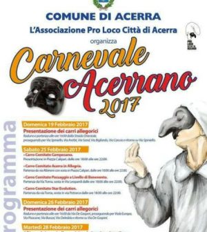 ACERRA – Torna la tradizione del Carnevale Acerrano: da domani domenica 19 febbraio 2017 e fino a martedì 28 febbraio 2017 ricco il programma degli eventi organizzati dalle Associazioni “Pro Loco Città di Acerra” e “Pulcinella per Acerra”, con il patrocinio ed il contributo economico del Comune di Acerra.