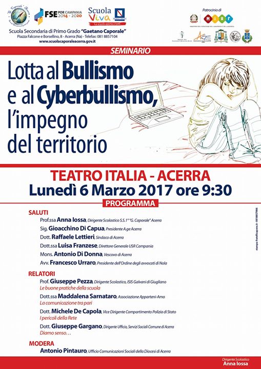ACERRA – «Lotta al Bullismo e al Cyberbullismo. L’impegno del territorio». Se ne parlerà lunedì mattina 6 marzo a partire dalle ore 9.30 ad Acerra nel Teatro Italia. Il Seminario, promosso dalla Scuola Media Statale Gaetano Caporale, è il primo di due appuntamenti – l’altro sarà il 5 aprile – per mettere un punto fermo nel contrastare i disagi derivanti da questa nuove forma di degrado sociale. Per farlo, è prima necessaria «l’analisi dei bisogni», obiettivo principale dell’appuntamento di domani, dichiara la dirigente della Scuola Caporale, Anna Iossa, per la quale il seminario mira a porre le condizioni per «prevenire il disagio, la devianza, i comportamenti a rischio» e favorire «la costruzione del benessere con sé stesso, con gli altri, con l’ambiente», sviluppando una «coscienza consapevole» ed educando al «senso civico». Ma la prevenzione ha bisogno della «rete» tra i diversi agenti sul territorio «in un percorso di convergenza verso la scuola», continua la preside Iossa.