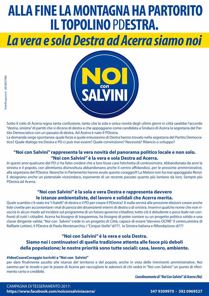 “Noi con Salvini” è la sola e vera Destra e rappresenta davvero le istanze ambientaliste, del lavoro e solidali che Acerra merita. Quale scambio c’è stato tra “i fratelli” di destra e il PD per creare il PDestra ? A nulla servirà alle prossime elezioni creare anche liste civette per accontentare i mal di pancia dei dissenzienti interni di destra o di sinistra. Inserirvi qualche nome che non riuscirà in alcun modo ad incidere sul programma di un futuro governo cittadino; tutto ciò è deludente e poco leale nei confronti di tutti i cittadini. Acerra ha bisogno di trasparenza, ha bisogno di poter contare su un progetto politico solido e una classe dirigente valida. “Noi con Salvini” crede in un progetto di Città, capace di essere “davvero OLTRE” il Centro, Sinistra di Raffaele Lettieri, il PDestra di Paola Montesarchio, i “Cinque Stelle” di ???, la Sinistra Italiana e Rifondazione di ??? “Noi con Salvini” è la vera e sola Destra. Siamo noi i continuatori di quella tradizione attenta alle fasce più deboli della popolazione; le nostre priorità sono tutte sociali: casa, lavoro, ambiente.