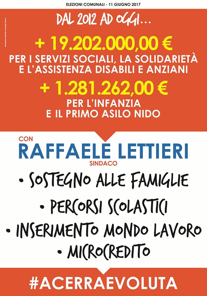 La campagna di comunicazione con manifesti murali è iniziata oggi con l’hashtag #acerraevoluta, che confronta quanto realizzato negli ultimi cinque anni dall’Amministrazione Lettieri sul piano dei servizi sociali, con più di 19 milioni di euro destinati ai servizi sociali, alla solidarietà e all’assistenza ai disabili e agli anziani, e 1.281.261,00 euro di risorse rivolte all’infanzia e al primo asilo nido comunale della città in favore delle donne lavoratrici. Nei prossimi cinque anni la coalizione “Centro, Sinistra” realizzerà con i nuclei familiari un vero e proprio “Patto con i Servizi Sociali”: gli interventi per le persone in difficoltà, infatti, saranno erogati instaurando un patto con le famiglie, con una reciproca assunzione di responsabilità.