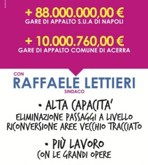 ACERRA – Punti chiari, precisi e dati misurabili. Continua la presentazione del programma elettorale del candidato sindaco della coalizione “Centro, Sinistra” di Acerra Raffaele Lettieri, primo cittadino uscente che in questi giorni sta illustrando le proprie proposte, in piena continuità politica con gli ultimi cinque anni. Programma che si affianca ai risultati concreti raggiunti dall’Amministrazione Lettieri: 10 milioni di euro di gare pubbliche bandite dal Comune di Acerra e 88 milioni di euro di gare bandite dalla Stazione Unica Appaltante del Provveditorato alle Opere Pubbliche di Campania e Molise per lavori, opere e servizi sul territorio. Con l’hasthag #acerracambiata Lettieri ed i candidati al consiglio comunale stanno illustrando la parte del programma che riguarda il lavoro, le grandi opere, il rilancio del centro storico e l’Alta Capacità.