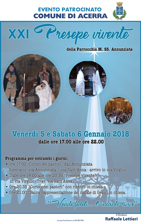 Il programma per entrambi i giorni prevede alle 17 la partenza dall’Annunziata del “Corteo dei Pastori” con arrivo in via Virgilio. Qui sarà possibile visitare il presepe dalle 18 alle 20.30, quando è previsto il corteo di rientro in chiesa dove avrà luogo, alle ore 21 “La Sacra rappresentazione del Natale di Gesù”.