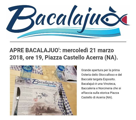 ACERRA – In controtendenza rispetto a quanto purtroppo avviene sul territorio, la famiglia Esposito rilancia la storica attività di famiglia con una nuova iniziativa commerciale – e non solo – all’insegna della tradizione, del buon mangiare e del buon bere. Apre questa sera a piazza Castello ad Acerra, infatti, ‘Bacalajuò’, la nuova osteria-vinteca targata Esposito, che da quattro generazioni importa direttamente stoccafisso e baccalà. A deliziare i palati ci penserà la cucina che è un mix di tradizione ed innovazione grazie alla capacità ed alla competenza di Anna Trinchillo e chef Ronnie, tra le novità più interessanti del panorama gourmet nazionale.