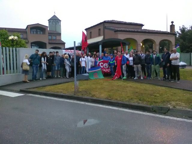 Una consistente delegazione ha manifestato ieri mattina davanti ai cancelli dell’azienda emiliana dove gli operai del primo turno hanno scioperato in segno di vicinanza.