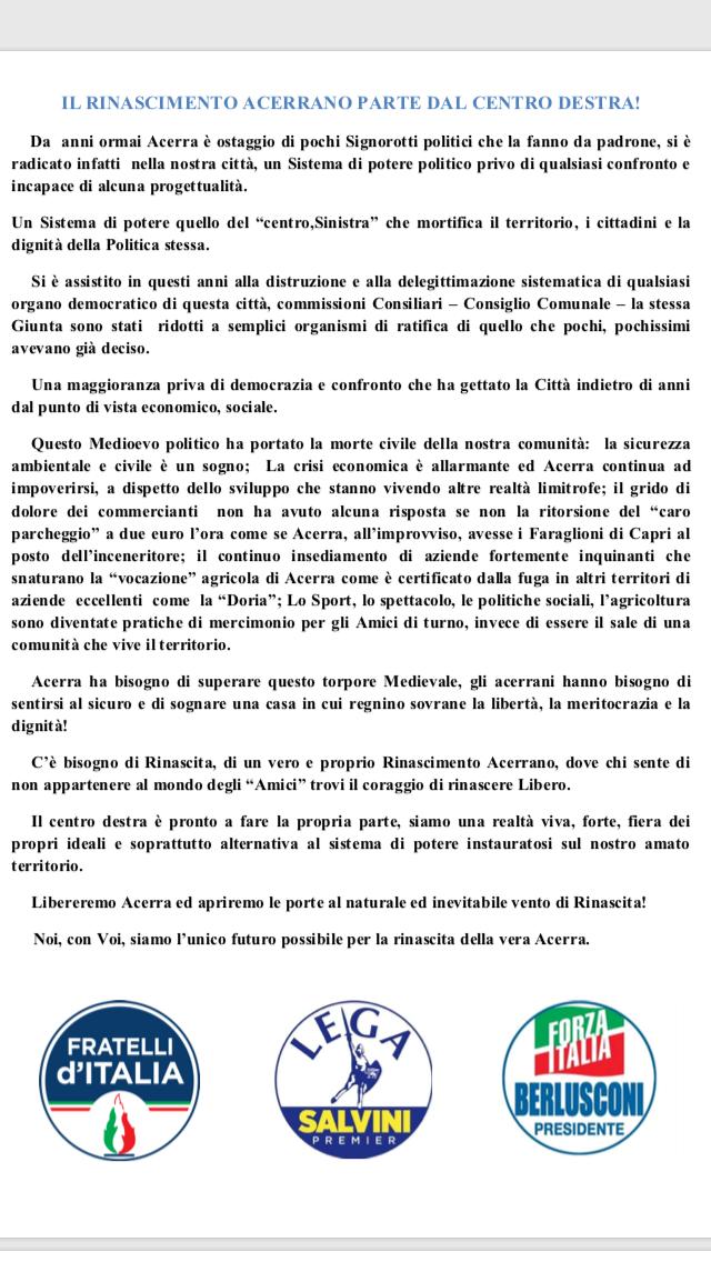 ACERRA – Non è nemmeno nato che il centrodestra acerrano sembra già diviso a causa della ‘guerra’ per i simboli dei partiti. Il tutto nasce da un documento diffuso a nome di Forza Italia, Lega e Fratelli d’Italia che auspica la nascita di un ‘Rinascimento acerrano’ sotto la guida del centrodestra locale. Se per Fdi fila tutto liscio, senza ‘ostacoli’ ed ingerenze varie, per i ‘berlusconiani’ ed i ‘salviniani’ la questione è differente. Il manifesto sottoscritto, infatti, porta la simbolica ‘firma’ di Salvatore Buonincontro, commissario cittadino forzista, carica conferitagli lo scorso maggio dall’onorevole Antonio Pentangelo, coordinatore provinciale del partito. Un manifesto dai toni forti che parla di una “Acerra ostaggio di pochi signorotti politici che la fanno da padrone”.