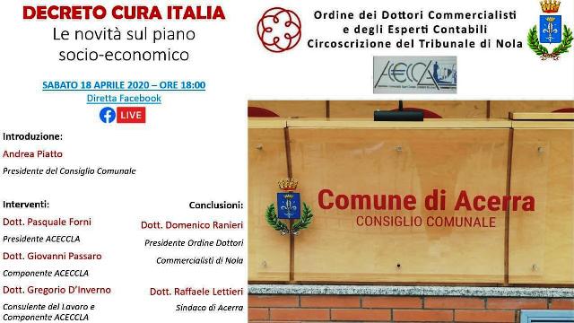 ACERRA – Le novità socio economiche del decreto Cura Italia. Se ne discute domani alle 18 in un diretta Facebook promossa dal consiglio comunale di Acerra e dall’Ordine de Commercialisti ed Esperti Contabili della Circoscrizione del tribunale di Nola.