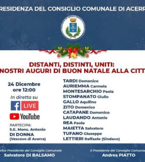 “Questo ci impone serietà e responsabilità, per portare fuori dalla fase Covid 19 la nostra città ma anche per continuare a programmare il domani. E’ con ragionata speranza per il futuro di Acerra e degli acerrani, pur a distanza, che porgeremo i nostri Auguri di Buon Natale. Il messaggio che S.E. Mons. Di Donna consegnerà a noi e alla città, a laici e cattolici, sarà risorsa e traccia per il nostro cammino di comunità.”