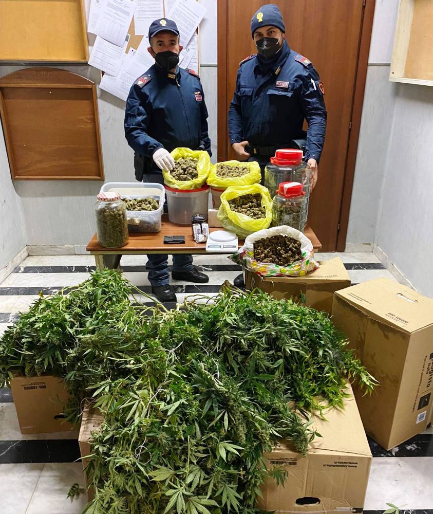 I poliziotti hanno rinvenuto nell’appartamento 9 piante di marijuana del peso complessivo di 12 chili, 8 contenitori con 3 kg della stessa sostanza già essiccata, 3 pezzi di hashish del peso di circa 250 grammi, 2 bilancini di precisione e 3040 euro; hanno