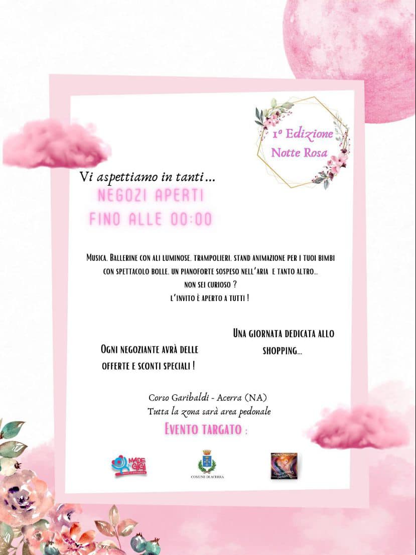 ACERRA – Negozi aperti ed un pianoforte sospeso in aria. E’ la notte rosa di Acerra, una manifestazione promossa dall’associazione ‘Colorando i Pensieri’ con il patrocinio del Comune di Acerra e prevista per questa sera al corso Garibaldi.
