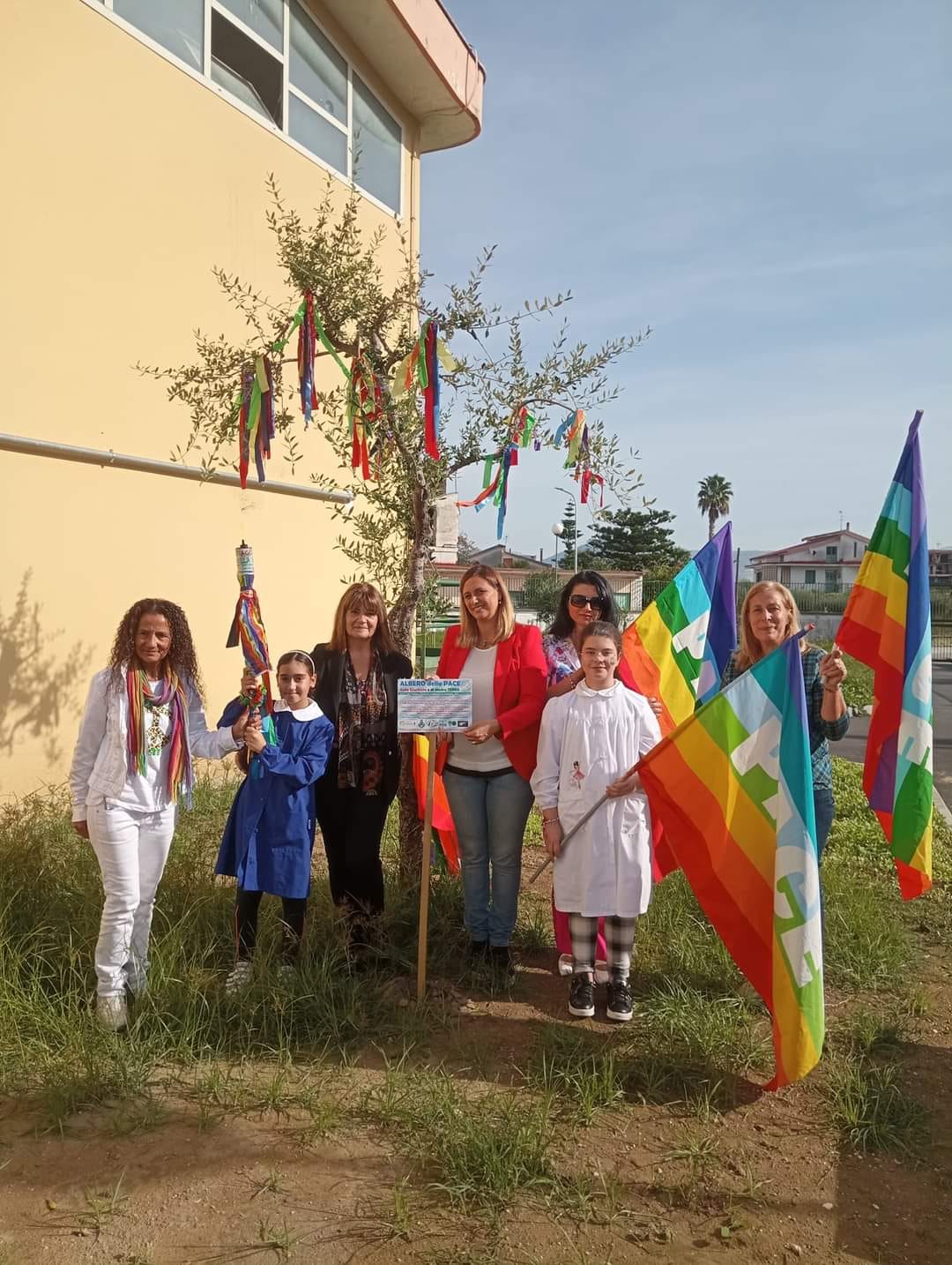 ‘Occhio alla Pace !’, questo il titolo che è stato dato alla simbolica iniziativa che in questo momento particolarmente critico acquista una valenza significativa. Il flash mob è stato organizzato dagli alunni delle classi quinte, splendidamente guidati dai docenti di fascia ed ha riservato momenti di vera emozione, caratterizzati da messaggi di pace in versi e in prosa culminati nel passaggio – di mano in mano – in una lunga ‘catena umana’ della fiaccola della Pace consegnata inizialmente dalla Presidente del Movimento per la Pace alla Dirigente scolastica che a sua volta l’ha consegnata agli alunni, insieme alla Bandiera della Pace, per giungere fino all’Albero della Pace dove è stata posizionata una nuova targa riportante la data della mobilitazione .