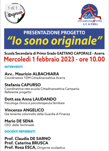 Domani 1 febbraio 2023, alle ore 10.00, sarà presentato presso la scuola secondaria di primo grado Gaetano Caporale di Acerra il progetto “Io sono originale” finanziato dal MISE “ora” MIMIT, che mira alla sensibilizzazione ed alla prevenzione nonché alla lotta del fenomeno della contraffazione.