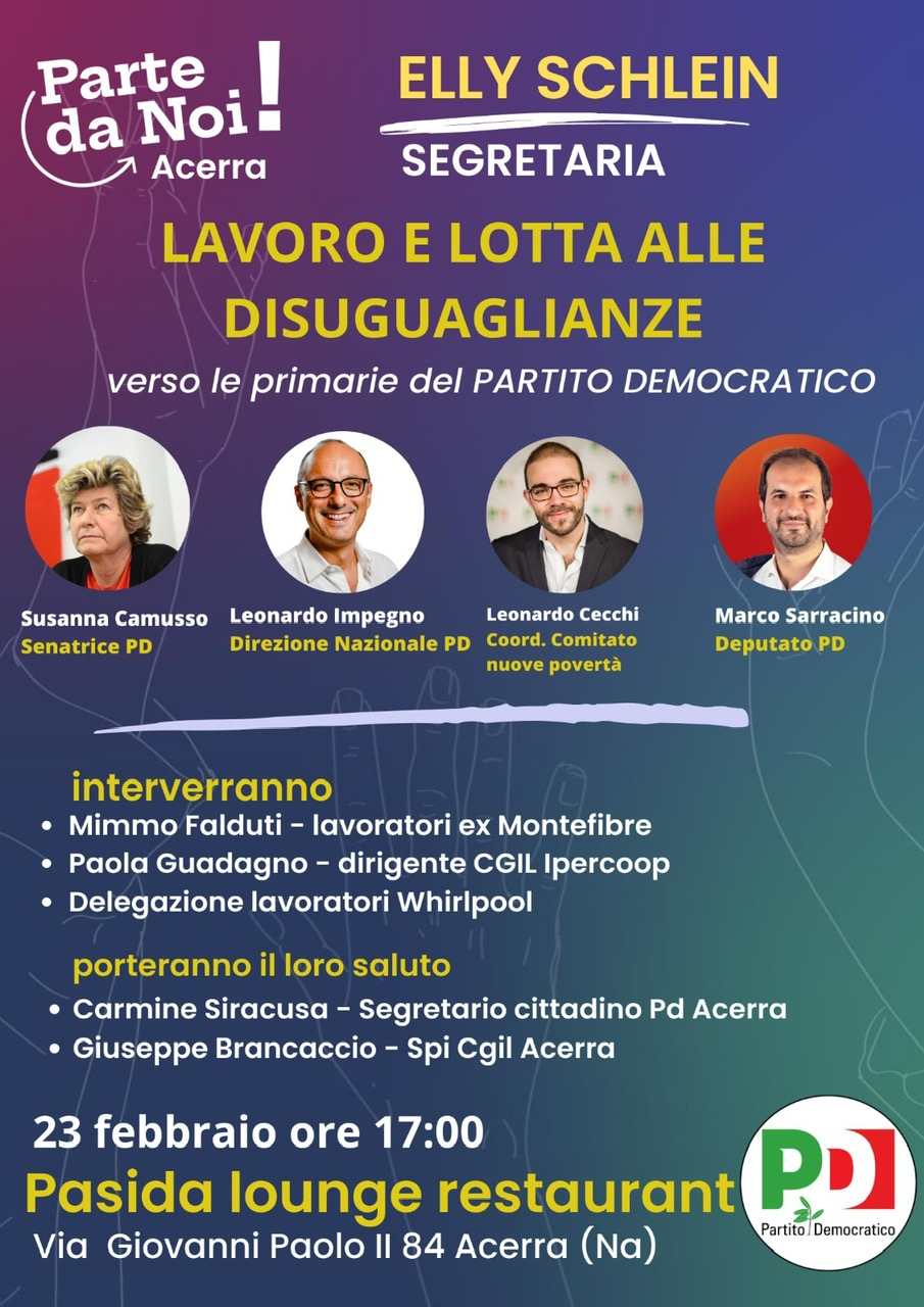 Proprio in vista delle primarie aperte di domenica, il Comitato cittadino ha organizzato per giovedì 23 febbraio ore 17.00 presso il Pasida Lounge & Restaurant di Acerra sito alla via Giovanni Paolo II n. 84, un momento di confronto su temi portanti del nuovo Pd, ovvero “Lavoro e lotta alle disuguaglianze” con la partecipazione della Senatrice PD Susanna Camusso, già Segretario Generale della CGIL, del avv. Leonardo Impegno, membro della direzione nazionale, già deputato del Pd, del dott. Leonardo Cecchi, Coordinatore del Comitato Parte da Noi – Nuove povertà e disuguaglianze ed ideatore del “reddito alimentare”, approvato con emendamento del Pd nella ultima legge di Bilancio, del Deputato Marco Sarracino, segretario provinciale del Pd Napoli.